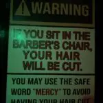 There’s a warning sign outside the barber shop: “If you sit in the barber’s chair, your hair will be cut. You may use the safe word ‘mercy’ to avoid having your hair cut.” But many guests let it happen.