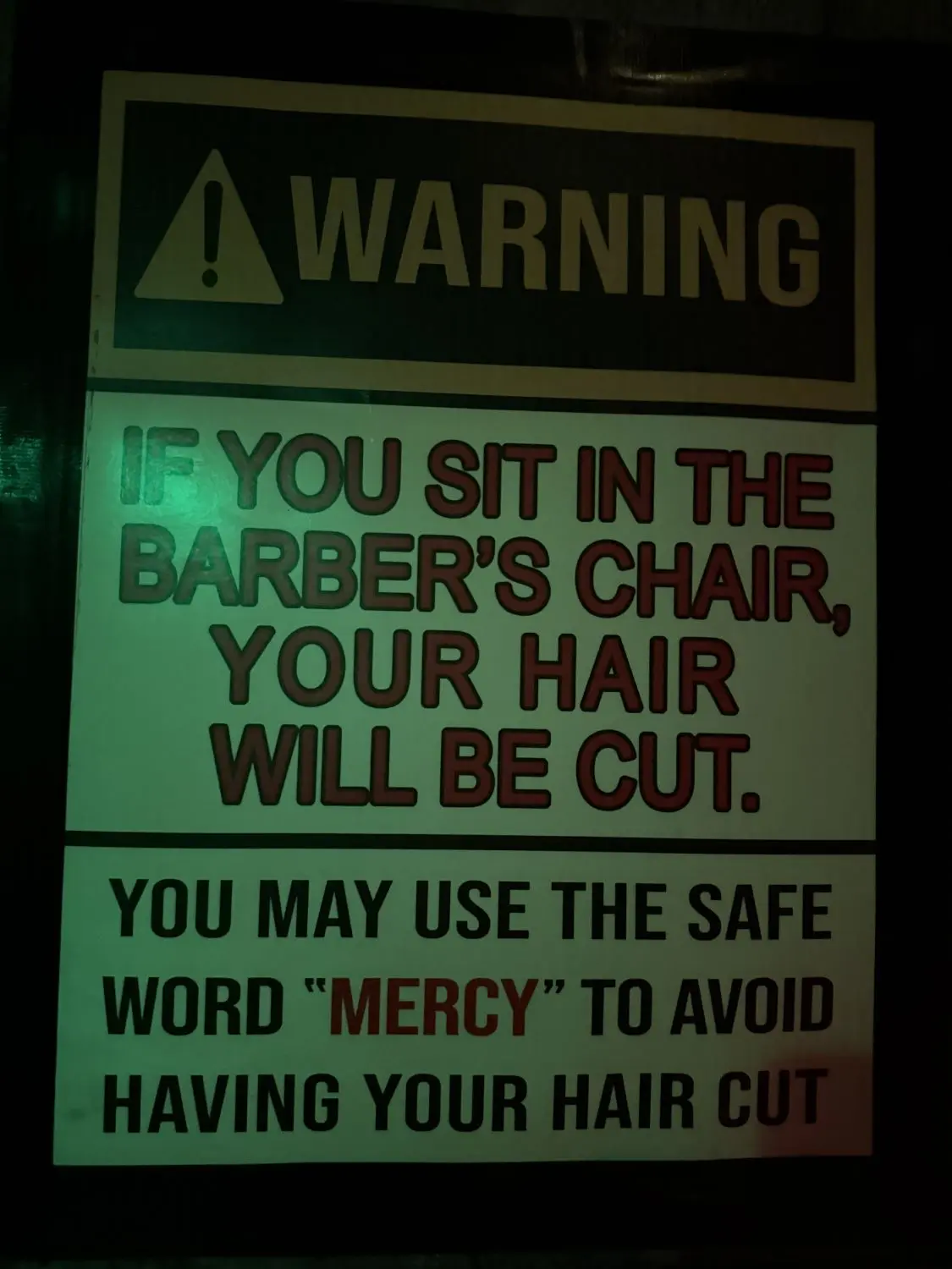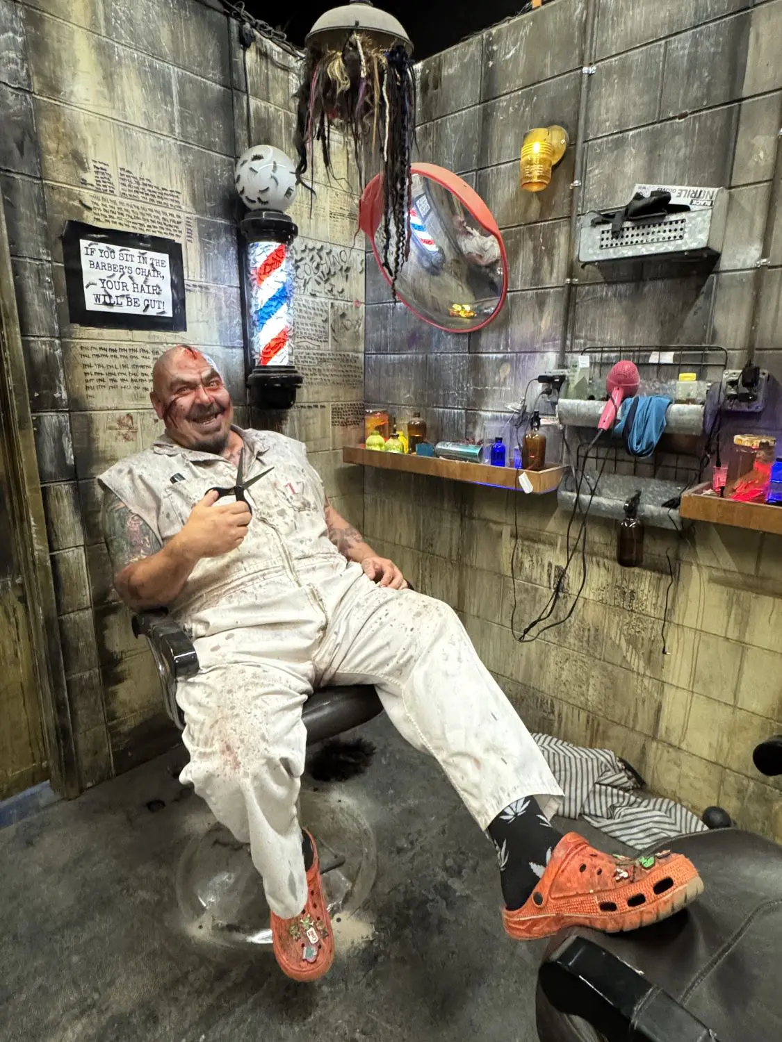 There’s a warning sign outside the barber shop: “If you sit in the barber’s chair, your hair will be cut. You may use the safe word ‘mercy’ to avoid having your hair cut.” But many guests let it happen.