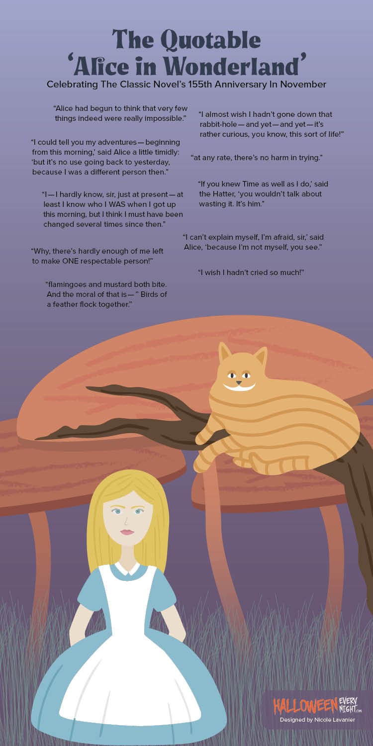 It’s been adapted many times in film, on stage, and in comic book or graphic novel form, but for this anniversary, Halloween Every Night presents simply a quotable Alice for fans and newcomers alike in an infographic by artist Nicole Lavanier.