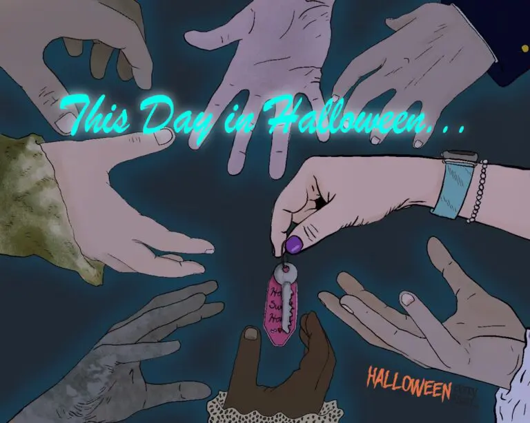 This Day in Halloween: The hit British ensemble sitcom -- and inspiration for the American version -- "Ghosts" premieres on BBC in 2019. / Illustration by Cheyenne Knehans