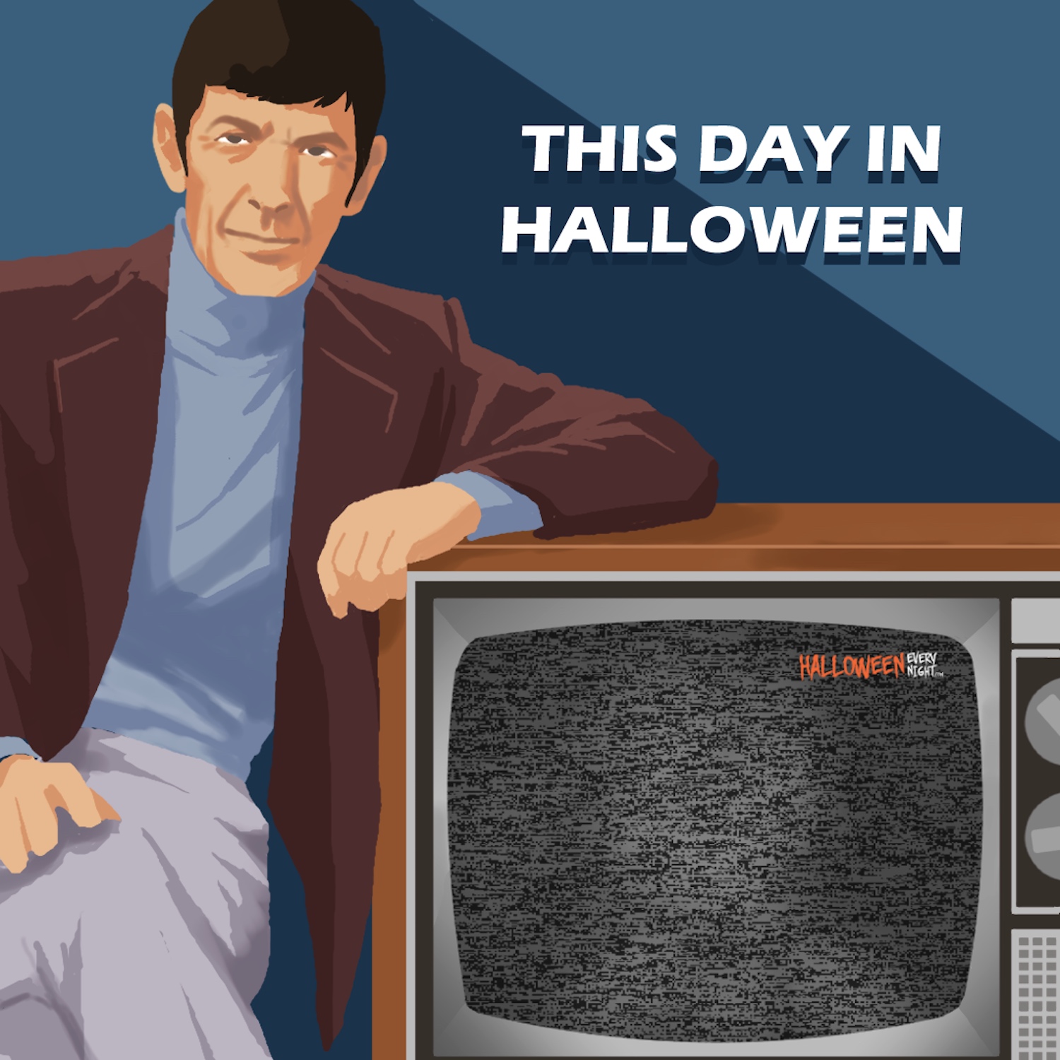This Day in Halloween: Influential documentary show "In Search of …" -- narrated by Leonard Nimoy -- premieres in syndication in 1977. / Illustration by Kyo Johnson