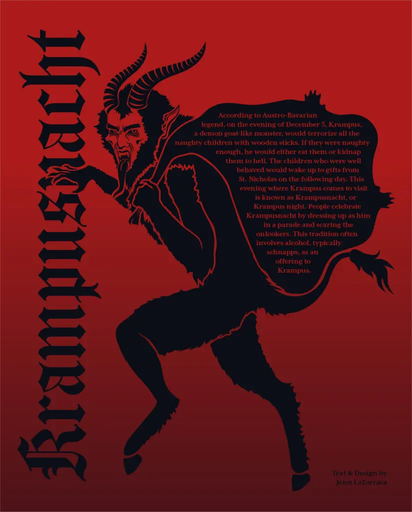 December 5 is Krampusnacht in Austro-Bavarian culture, but Americans have been digging the Christmas antithesis for a few years. To celebrate the big day, Halloween Every Night artist Jennifer LaTorracca put together the following graphic.