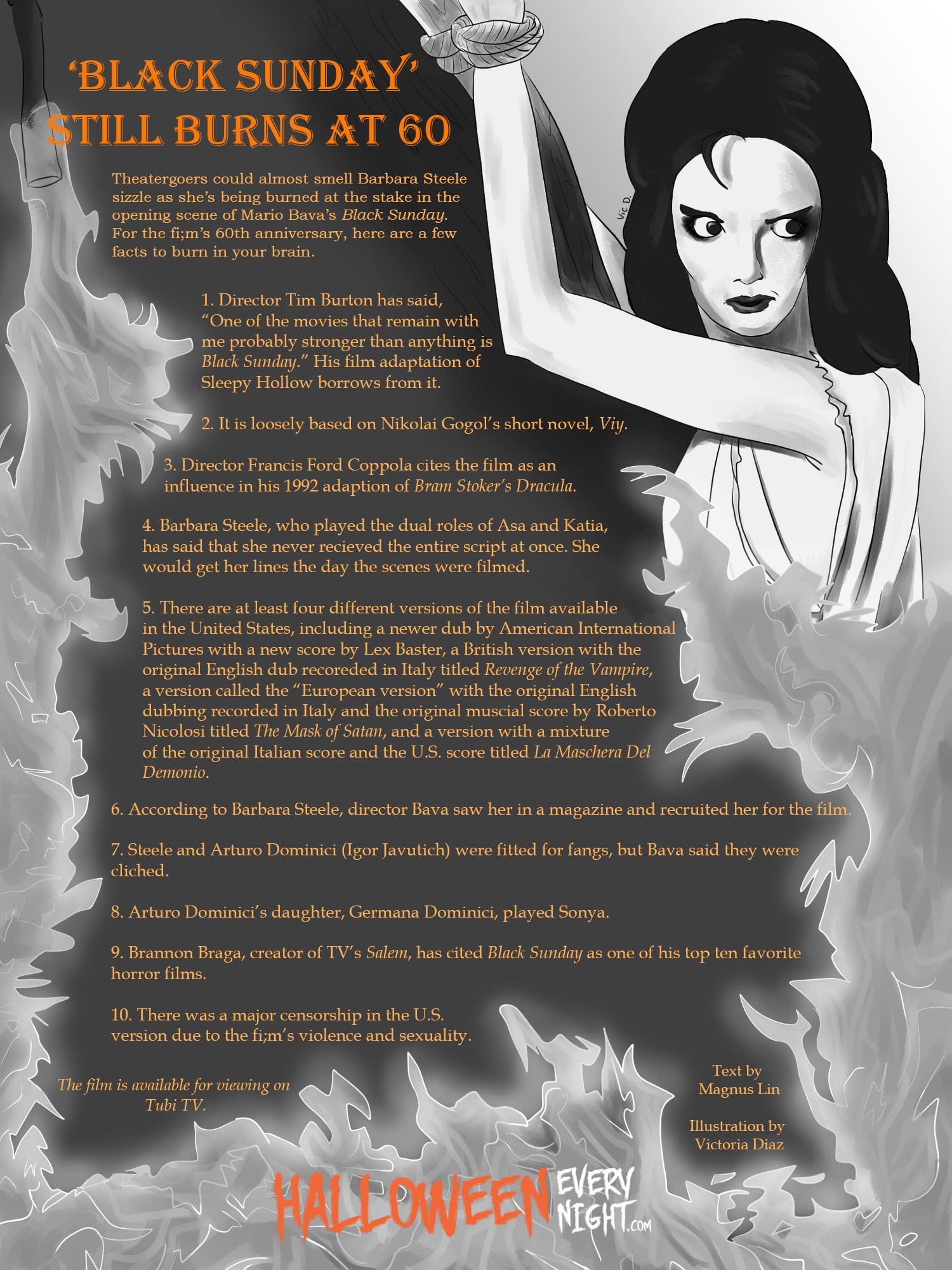 Black Sunday Still Burns At 60 M. L. Myers Halloween Every Night February 15, 2021 1963Mario Bava's 1961 classic "Black Sunday" turns 60 in February. Mario Bava built his reputation as a maker of Europe’s better horror films partly on his 1961 thriller Black Sunday, which turns 60 in February. Halloween Every Night offers up this collection of quick facts about the movie. 3