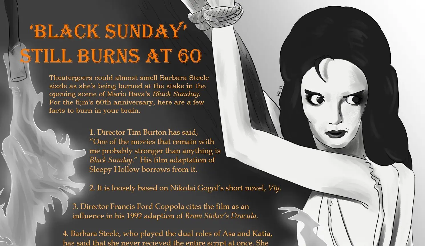 Black Sunday Still Burns At 60 M. L. Myers Halloween Every Night February 15, 2021 1732Mario Bava's 1961 classic "Black Sunday" turns 60 in February. Mario Bava built his reputation as a maker of Europe’s better horror films partly on his 1961 thriller Black Sunday, which turns 60 in February. Halloween Every Night offers up this collection of quick facts about the movie. 3