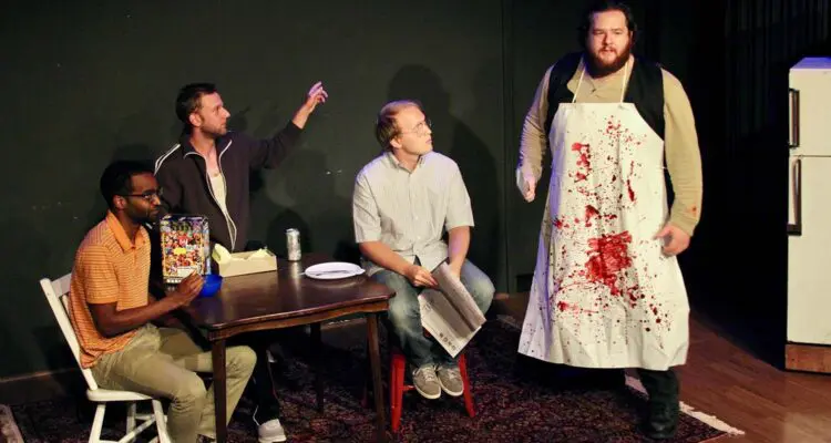 “Slaughterhouse” occurred to me after I had been living a few months in my very first apartment with some of my closest friends. I’d been meaning to write a classic door-slamming farce for a while, and after a couple of big fights brought us to each other’s throats, I had this realization that there must be people out there who live with serial killers and don’t even know it – or do, but have learned to cope. So this was my attempt to write a Noises Off-esque farce, but with an extremely dark twist.