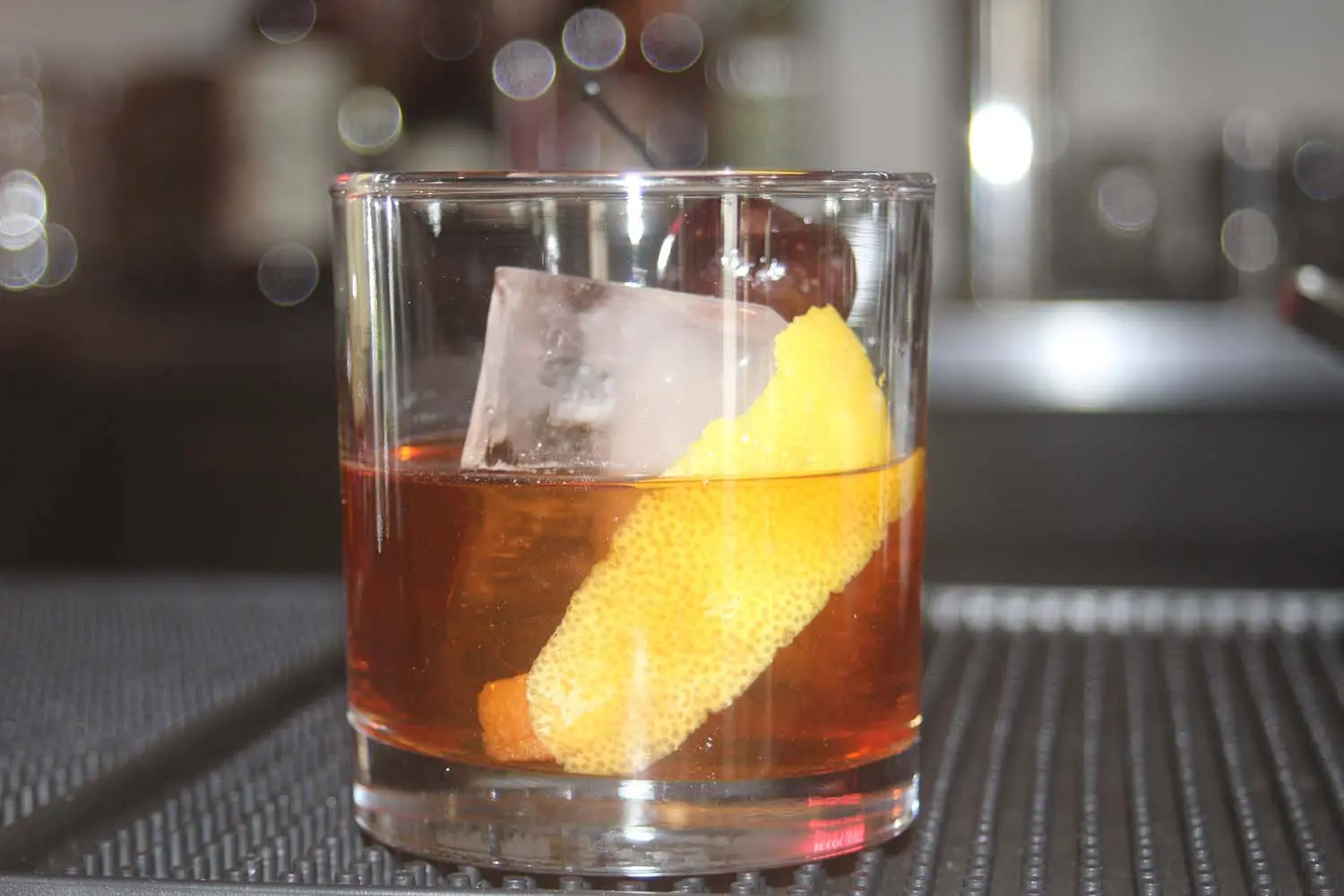 Place the sugar in a glass. Add the bitters and club soda, then stir with a spoon to dissolve the sugar. Add the whiskey, ice cube and garnish with the twist and the cherry. – Text and Recipe by Sarah Mosqueda