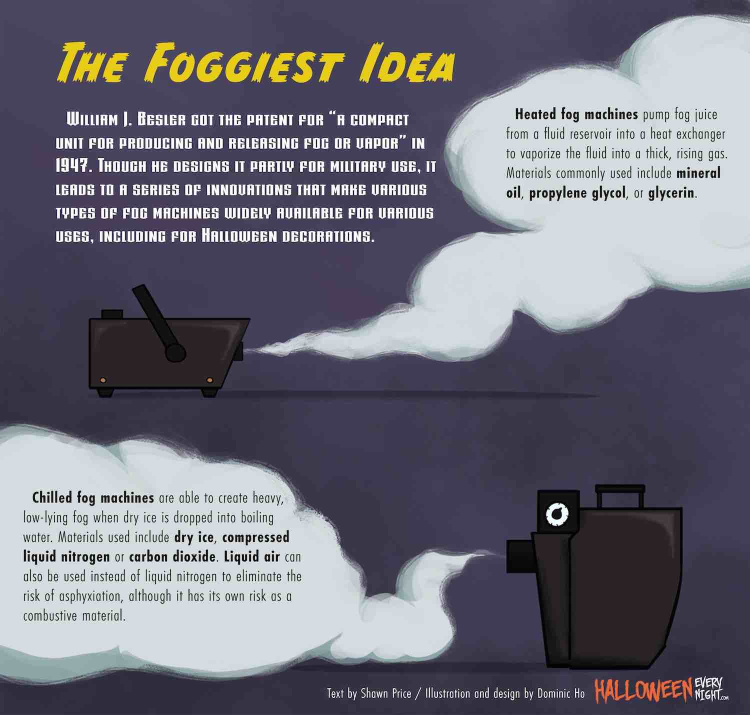 What you can now buy at plenty of stores around Halloween time, has had a long evolution. And its usage hasn’t always been purely theatrical. But the fog machine’s place in human fun is now firmly sealed, and to celebrate the 75th anniversary of William Besler’s invention Nov. 13, Halloween Every Night’s Dominic Ho put together this clickable infographic to help readers clear the mist on a few points about the fog machine.