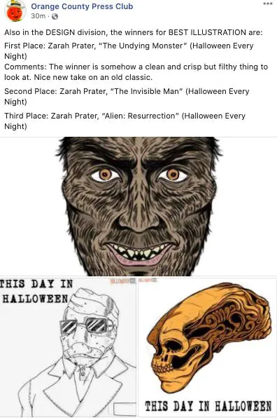 Halloween Every Night added nine awards on July 30, and now holds a total of 15 OC Press Club Awards in writing, illustrations/graphics, video and multimedia categories.