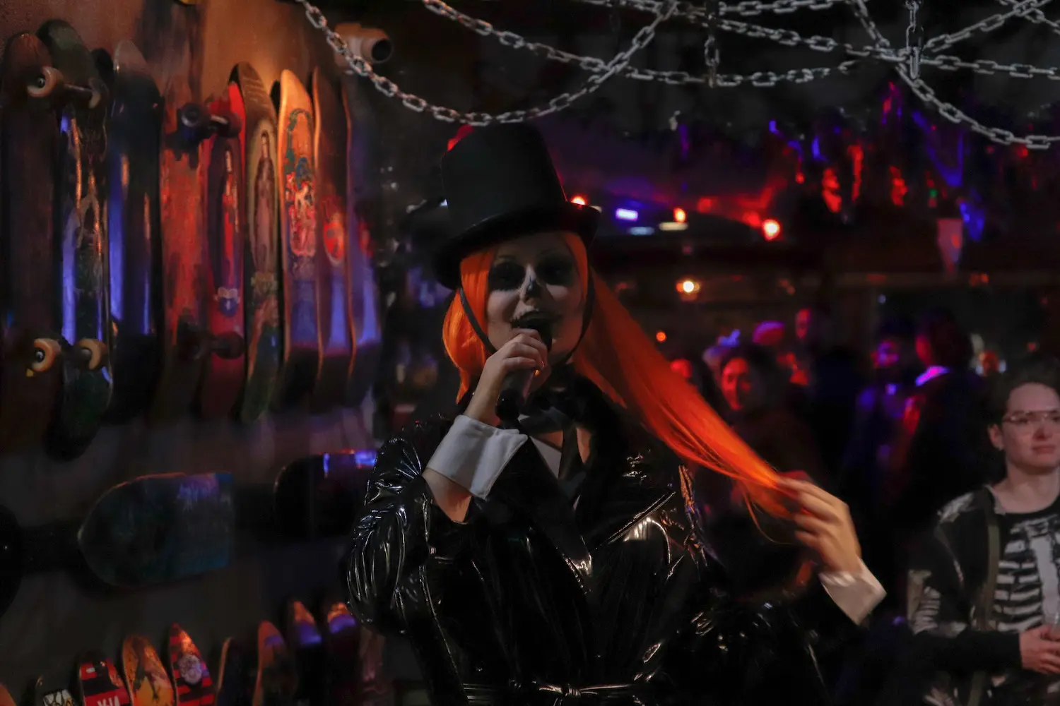 Stalactites, metal chains, and tattered fabric – all DIY decor created by the married duo themselves – line the ceiling, while the walls are covered inch by inch in vintage records, skateboards and classic horror movie posters.