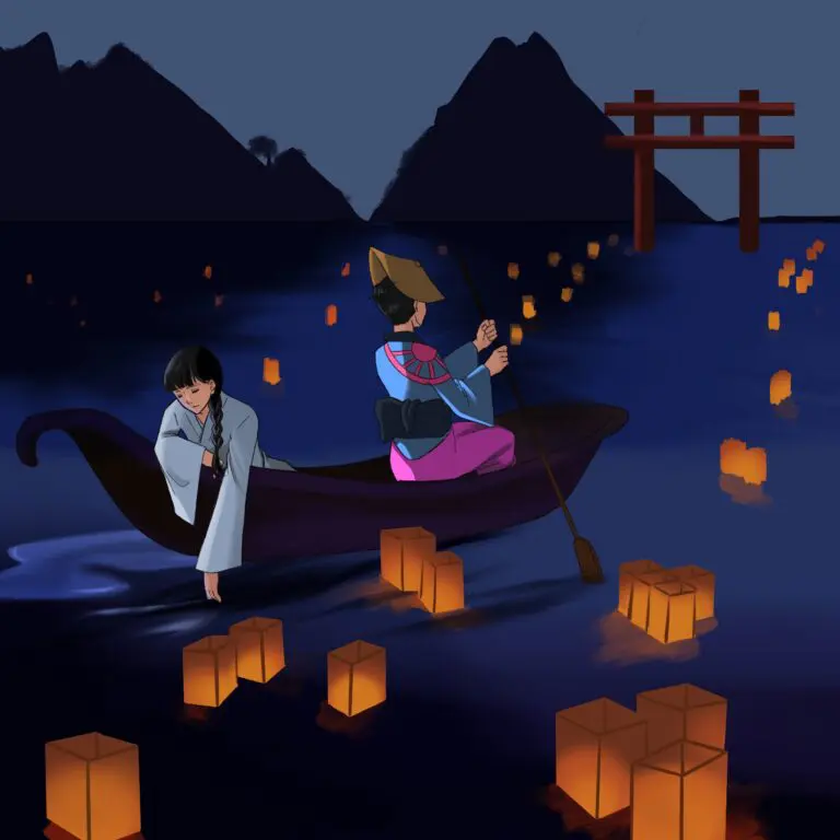 Midori’s memory of Obon serves her better. A steady rhythm resounds from mokugyo, wooden fish-shaped drums. The warm smell of incense mixes in with the ocean breeze. Deep umami flavors burst from her grandfather’s signature saba sushi. Like many Japanese families during Obon, Midori’s family went on vacation and traveled to where most of her ancestors were buried. This was her grandparents’ seaside home in Fukui Prefecture. Her fondest memory is of the volleyball games and post-dinner walks she enjoyed with her family during the hot summer nights of Obon.