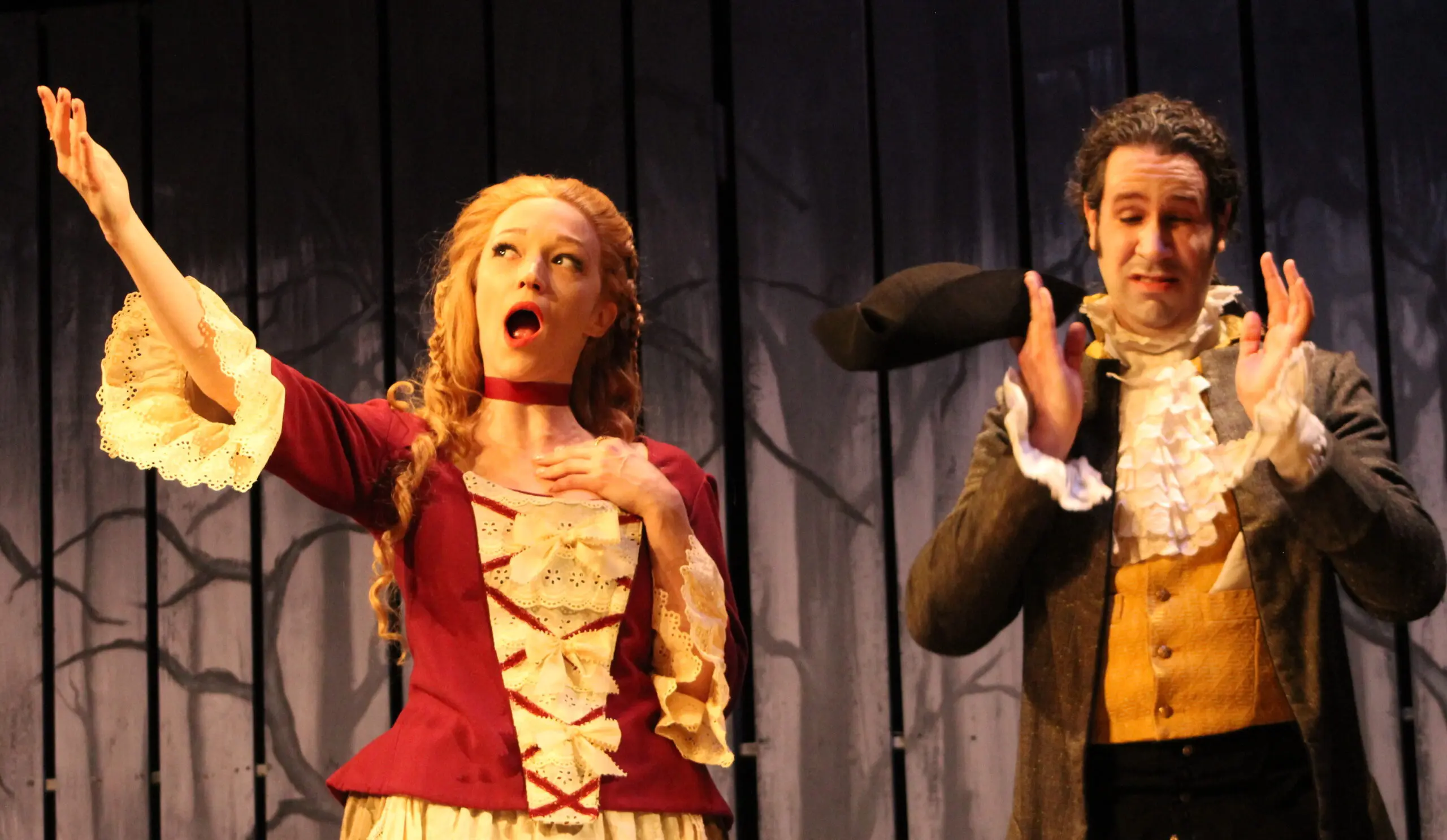Led by Kevin Garcia as Ichabod Crane and Kalinda Gray as Katrina Van Tassel, the play spins around the note perfect characterizations of Garcia’s nervously energetic Ichabod and Gray’s coyly confident Katrina. Longtime Maverick company player Nick McGee as Bram Bones pivots gleefully between the two, pleading and whimpering at Katrina’s feet, while trying to overpower Ichabod.