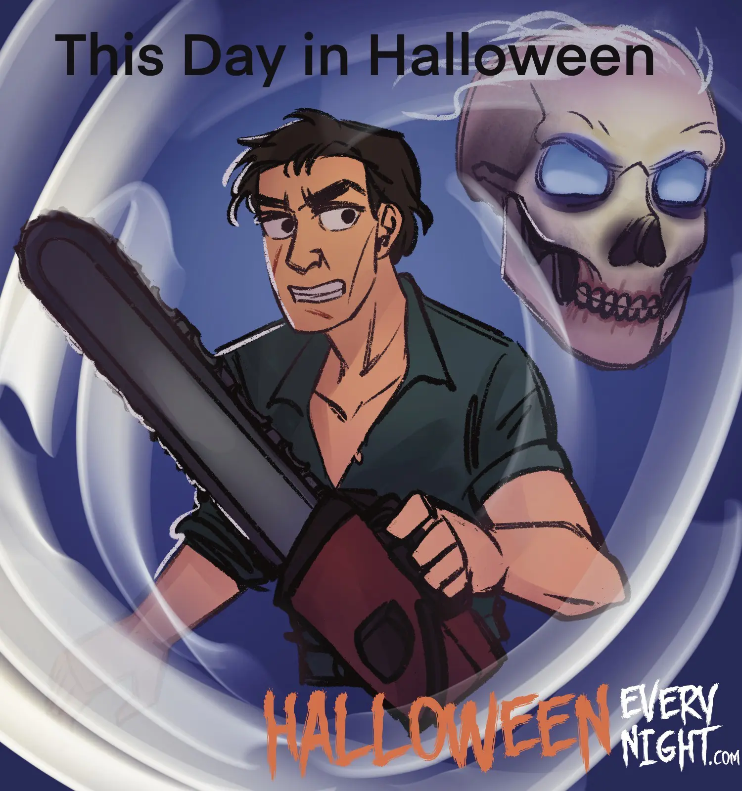 This Day in Halloween: Sam Raimi's horror comedy "The Evil Dead II" starring Bruce Campbell opens across the U.S. in 1987. / Illustration by Summer Ward