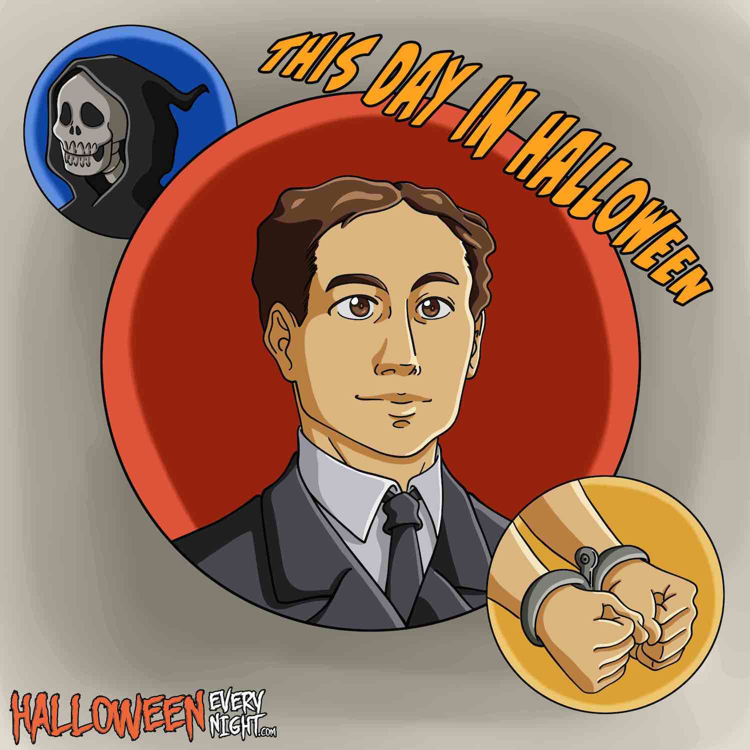This Day in Halloween: Magician, actor, and debunker Harry Houdini is born Erik Weisz in Budapest, Austria-Hungary in 1874. / Illustration by Jocelyne Reyes.
