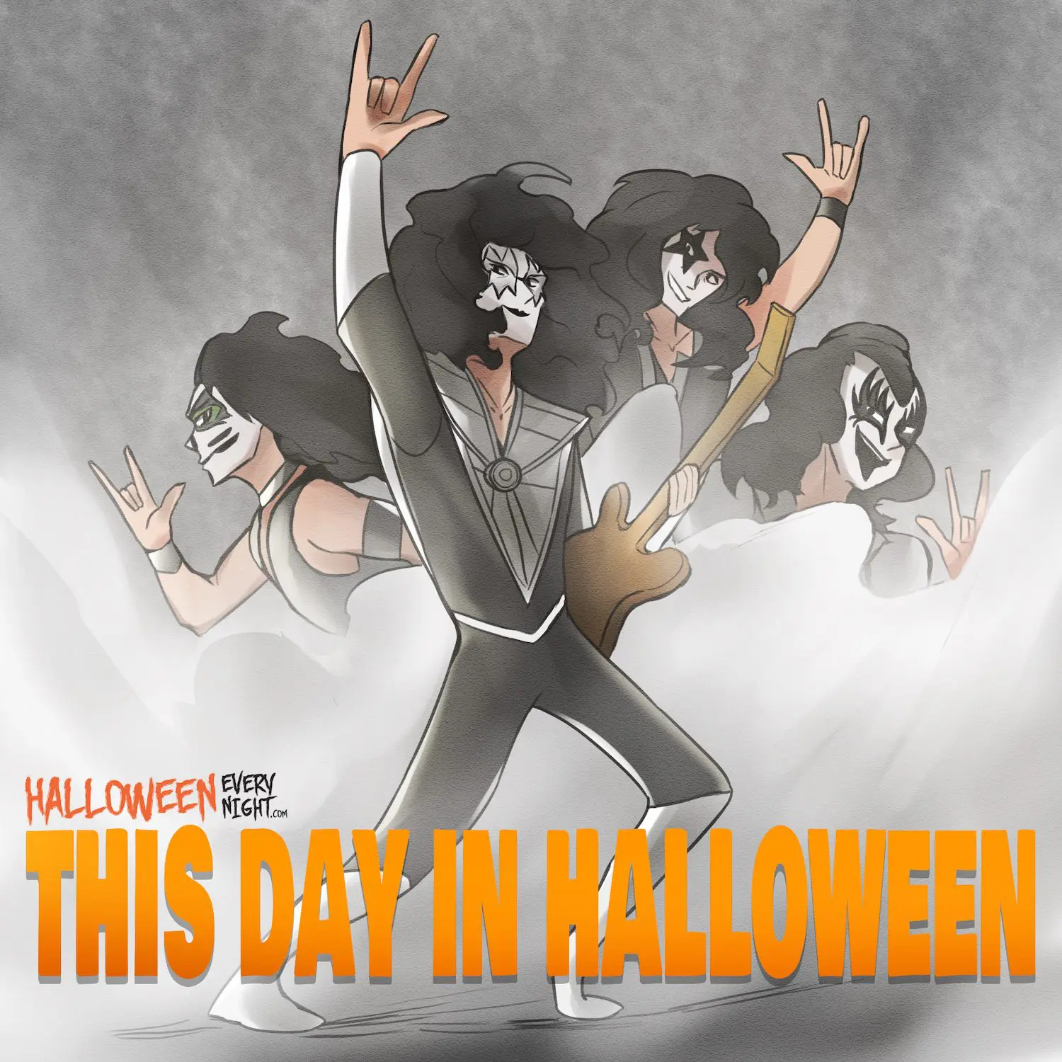 This Day in Halloween: Kiss performs in their trademark makeup for the first time at The Daisy in Amityville, New York in 1973. / Illustration by Andrew Truong