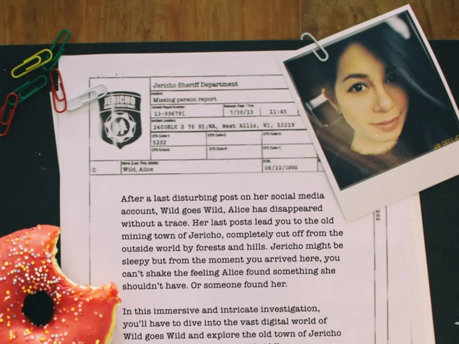 This is Missing in Jericho. A true crime role-playing game by Crimibox, a Belgian start-up. You and up to three players must step into the shoes of a detective to find out what happened to a social media influencer who went missing after visiting the old mining town of Jericho.