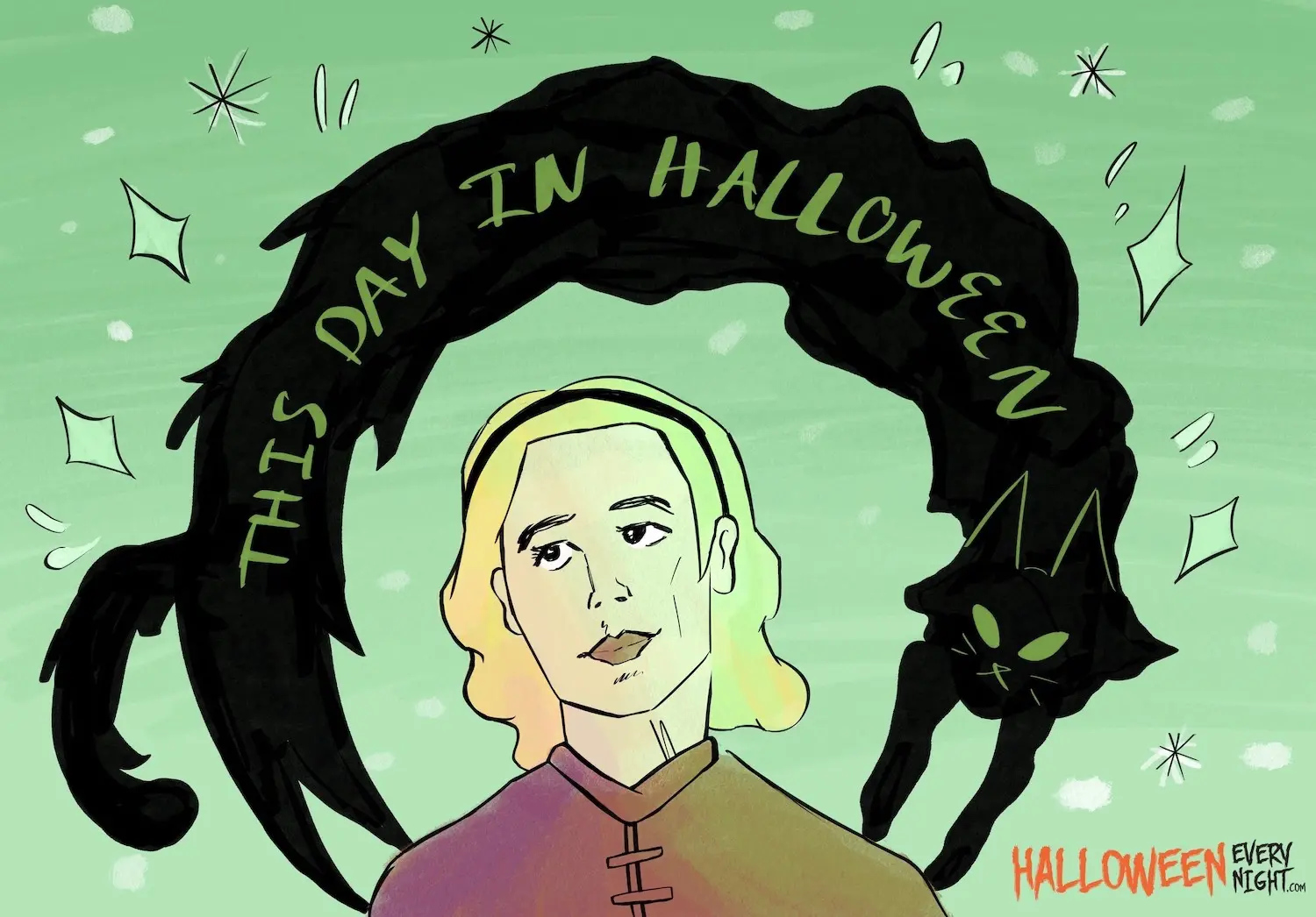 This Day in Halloween: Dark teen fantasy "The Chilling Adventures of Sabrina" starring Kiernan Shipka premieres on Netflix in 2018. / Illustration by Brooke Ramirez
