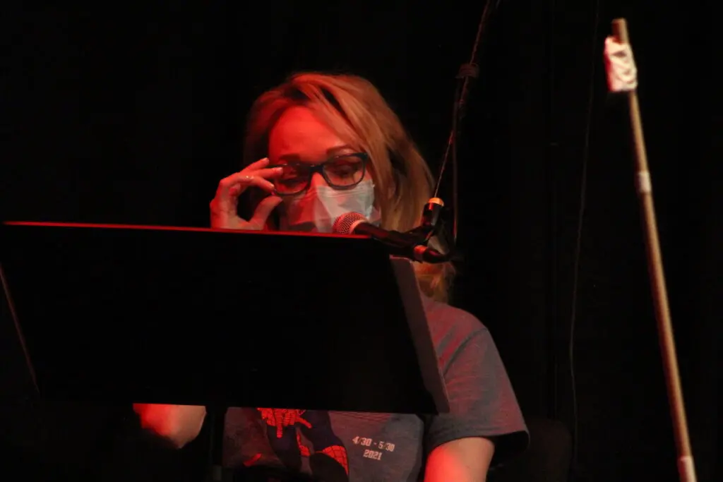 Cast members Paul Zelhart and Kalinda Gray, and sound effects artist Jon Gaw at work during the Maverick Theater's new production "Comic Reading: Spider-Man." The reading is providing the perfect Covid-safe way to reopen the Fullerton, CA theater. / Photo by Jessica Peralta